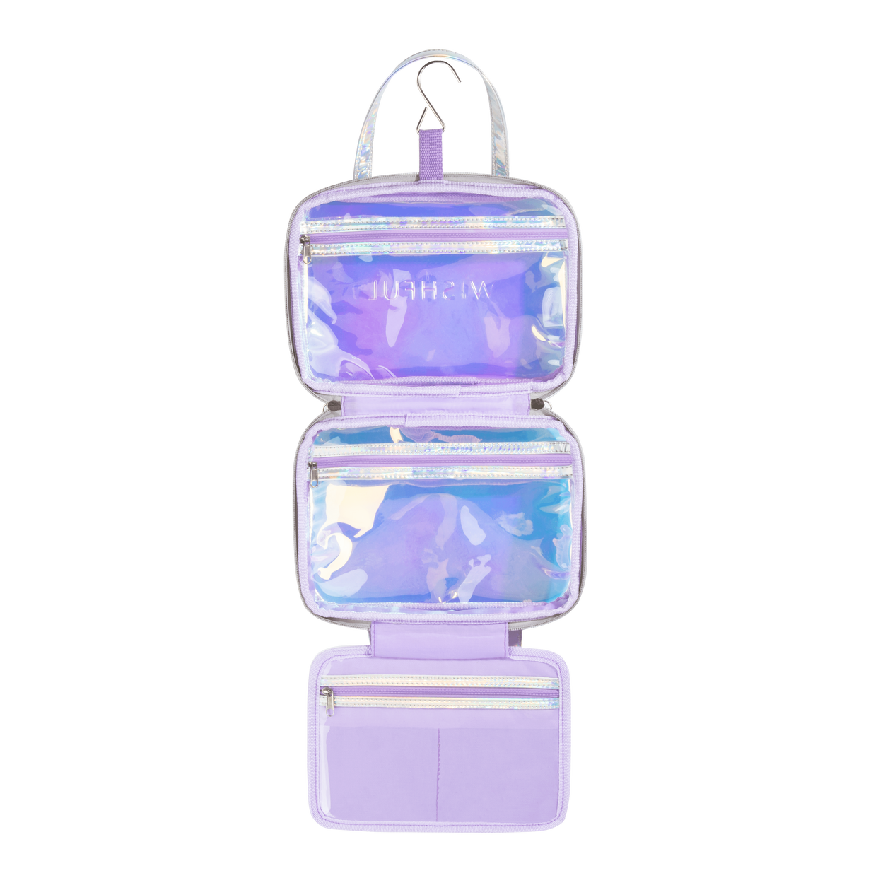 Our Wishful Skincare Bag is both practical and cute! Designed to suit all your skincare product needs, this toiletry bag gives a serious punch in the functionality department thanks to its 3 separated sections and hanger, AND in our favorite easy to clean, holographic material. Structured and compact, it is easy to fit into your suitcase (over packers, we hear you!) This is a dream come true for every beauty-lover, whether they’re jet-setting, business travelling or on a weekend stay-cay!
